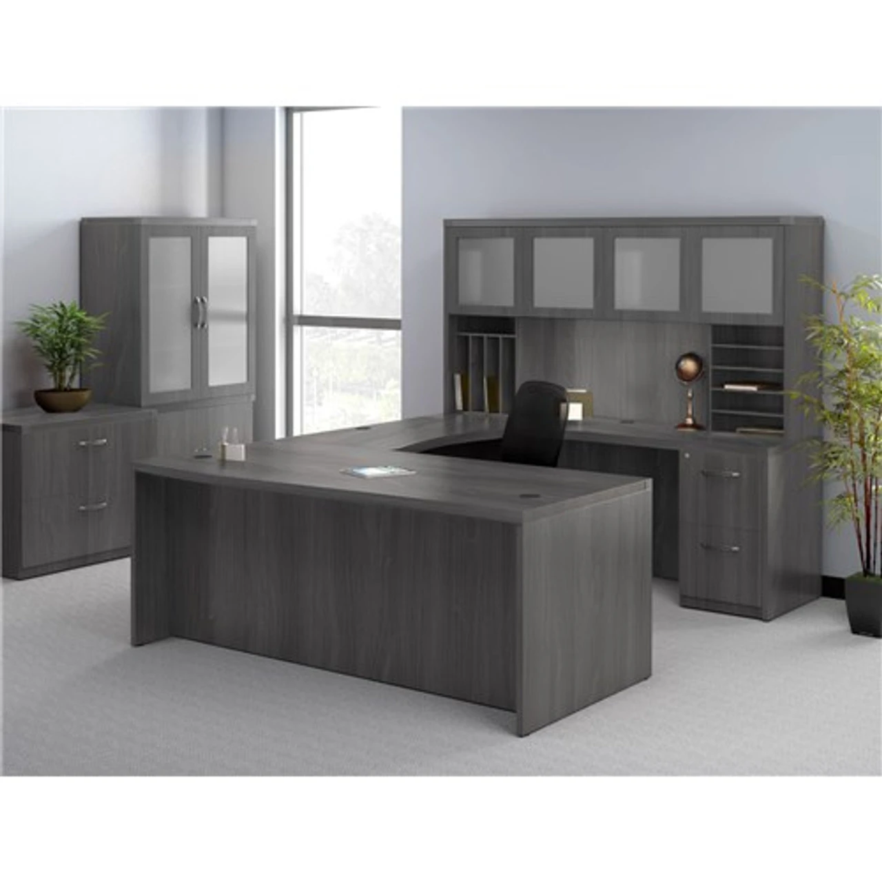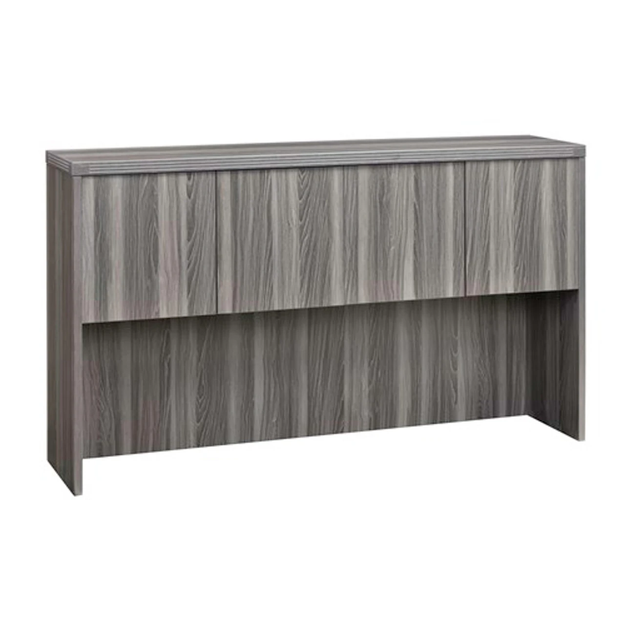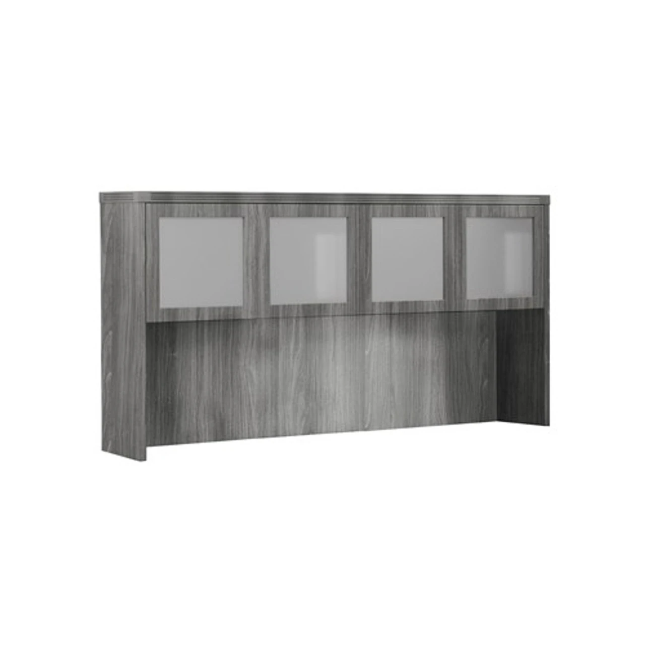 The Mayline Aberdeen series is our most popular laminate reception desk line. The Aberdeen Series 72″ office stack-on hutch comes with wood or glass cabinet style doors. The glass is tempered for safety and durability, and has four self closing doors. Both come in Grey Steel or Mocha laminate that coordinates with the Aberdeen series and can be stacked onto desking for additional storage. This reception desk hutch ships in 2-3 business days. Pair this with the Aberdeen 72” credenza.