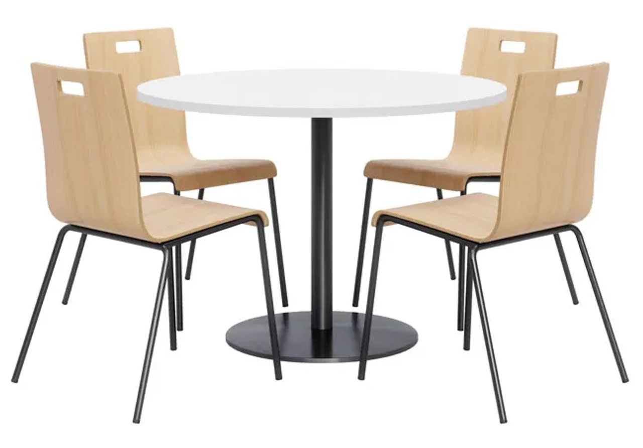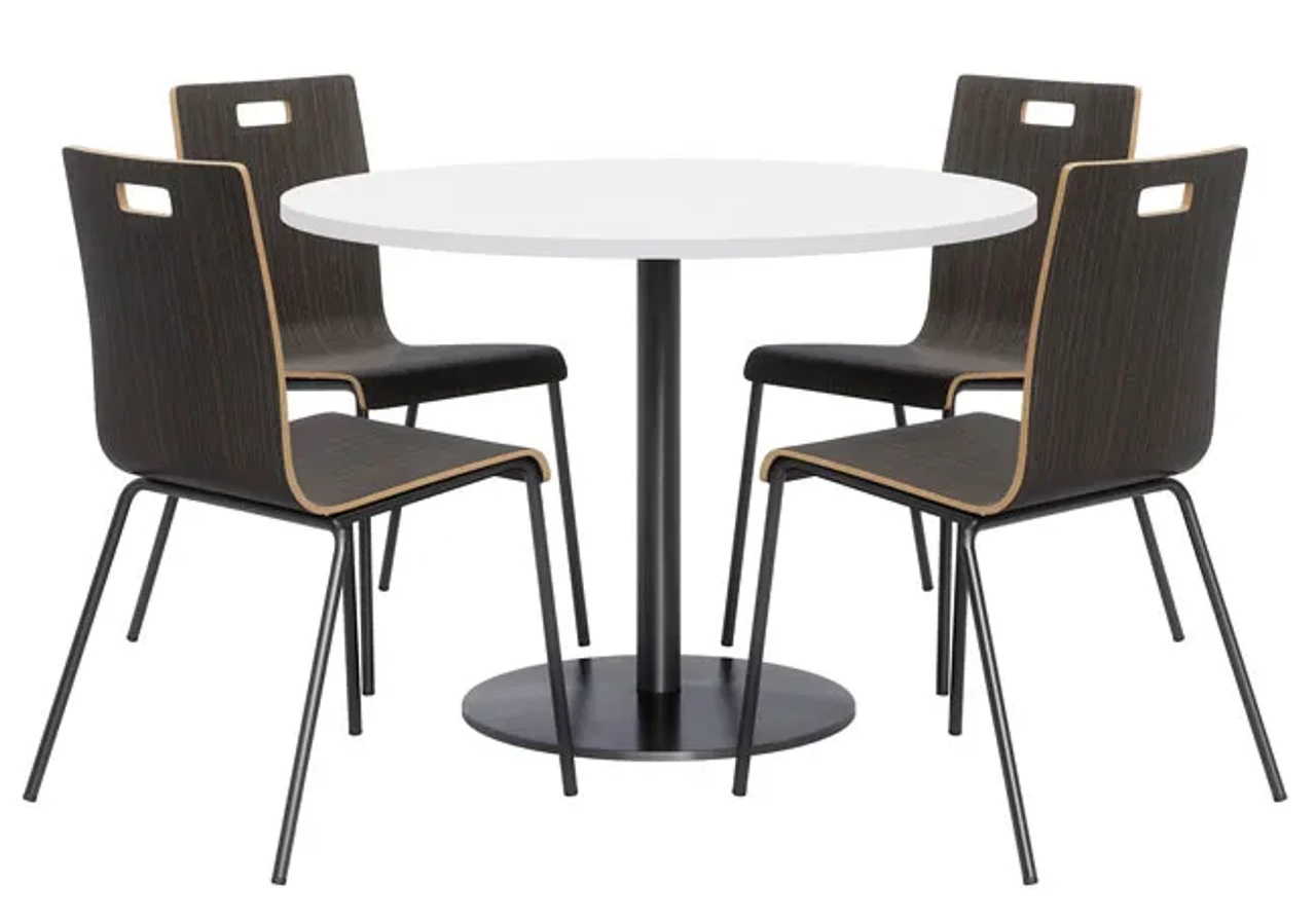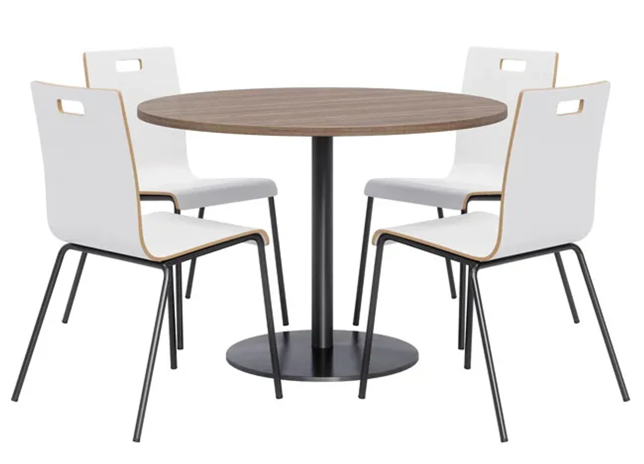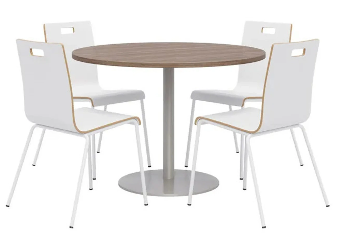 Make outfitting your breakroom or cafe area easy by ordering this KFI Breakroom Bundle with Proof Table & Jive Stack Chairs. This KFI bundle seats up to four people around a 42″ round pedestal table. Perfect for a dining room, break room, or bistro cafe. Chairs ship to your door fully assembled. Chairs stack 4 high and each include a handle for easy mobility. The 42″ Round Proof table surface allow for ample dining or working area.