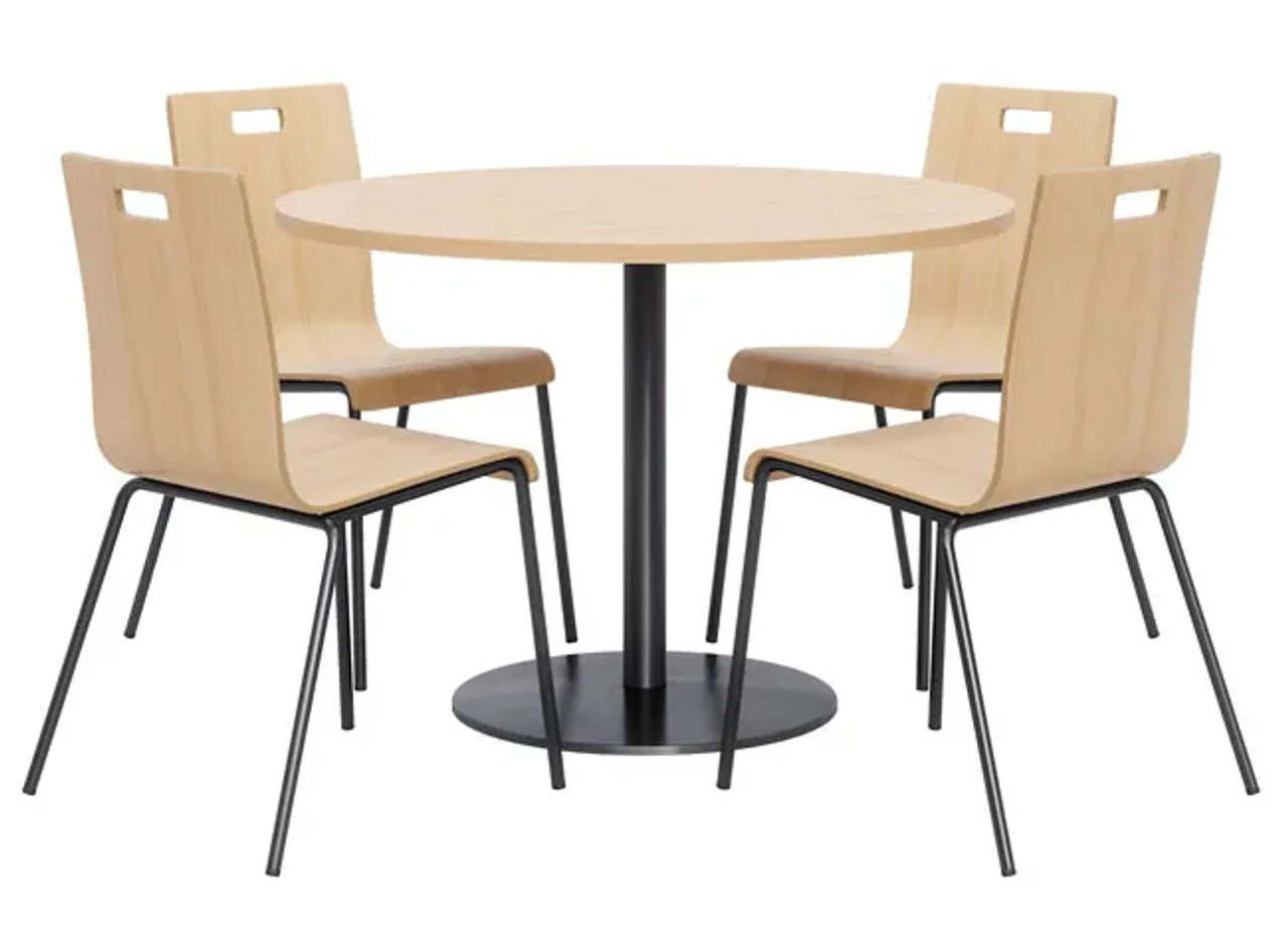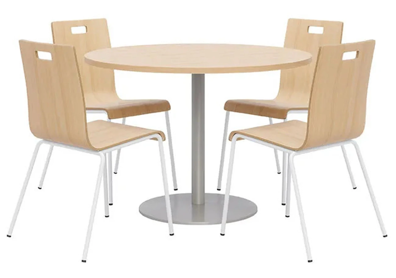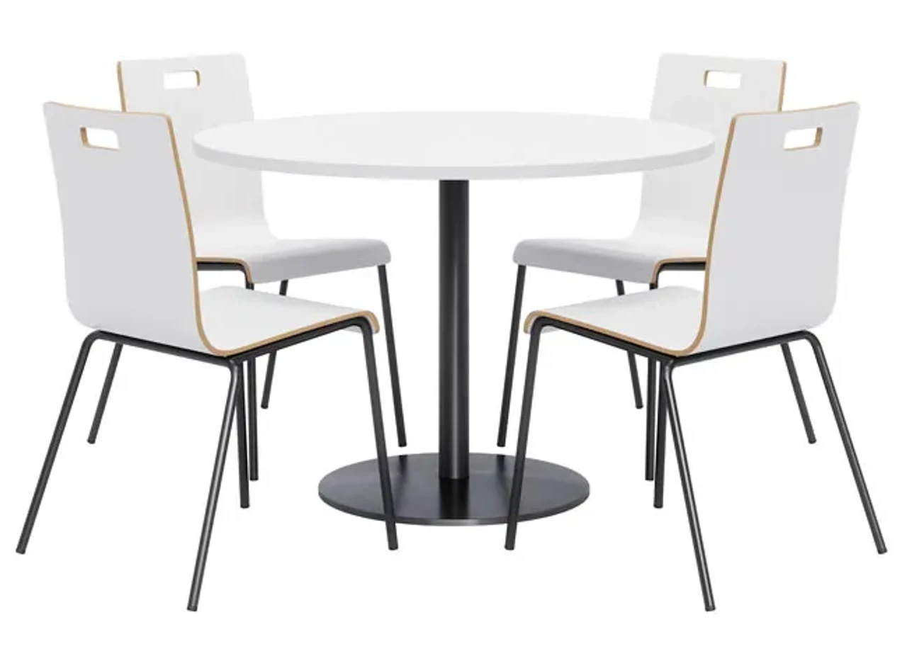 Make outfitting your breakroom or cafe area easy by ordering this KFI Breakroom Bundle with Proof Table & Jive Stack Chairs. This KFI bundle seats up to four people around a 42″ round pedestal table. Perfect for a dining room, break room, or bistro cafe. Chairs ship to your door fully assembled. Chairs stack 4 high and each include a handle for easy mobility. The 42″ Round Proof table surface allow for ample dining or working area.