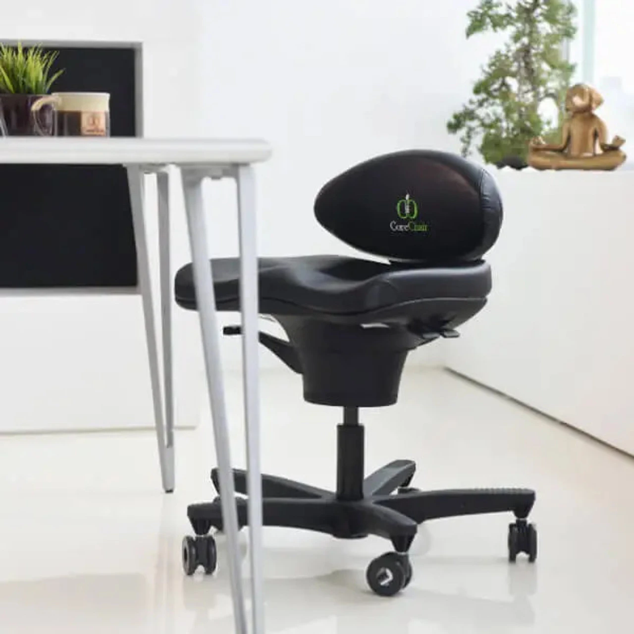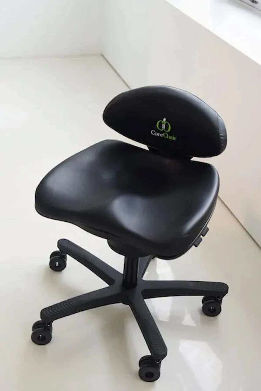 The CoreChair was created by Patrick Harrison, a Kinesiology who found himself increasingly treating people for back pain. The CoreChair’s main distinguishing feature is the low back cushion that supports the pelvis, while allowing for 14 degree movement in all directions. Without restricting, as tall chair backs do, it encourages active posture and alignment. While inspiring playful movement, it stimulates blood flow, mobilizes the joints, and strengthens core muscles as well as hydrating the vertebral discs. In fact, a study completed by Memorial University concluded that participants sitting in the CoreChair adopted a more upright posture, experienced less back pain and stiffness and had enhanced blood flow when compared to sitting in a traditional office chair. The CoreChair’s patented design delivers optimal support so that the muscles can stay in motion without becoming fatigued. See the video tab above for a great introduction to the CoreChair, as well as differences in the models available and even exercise videos.