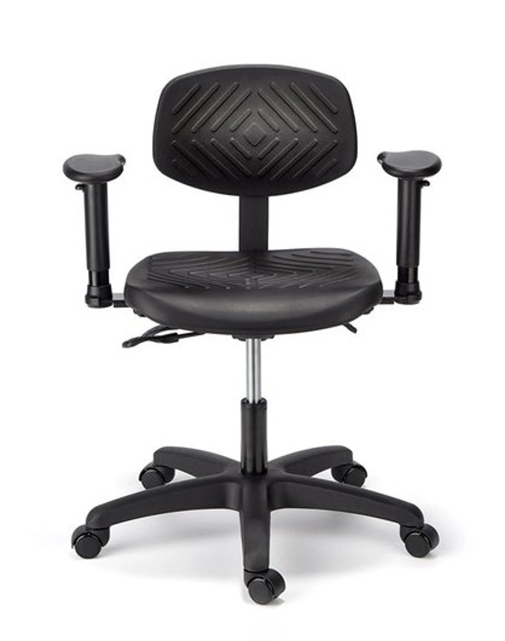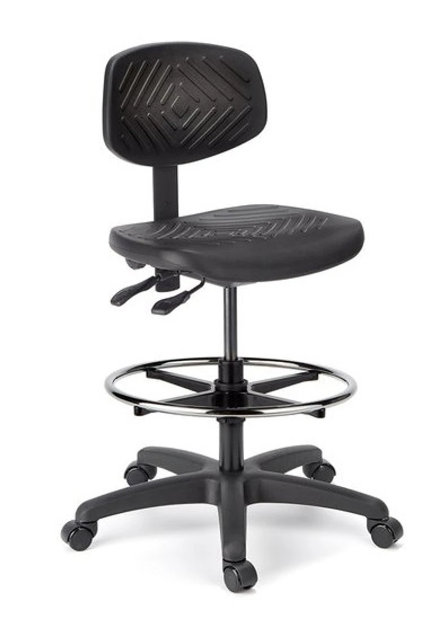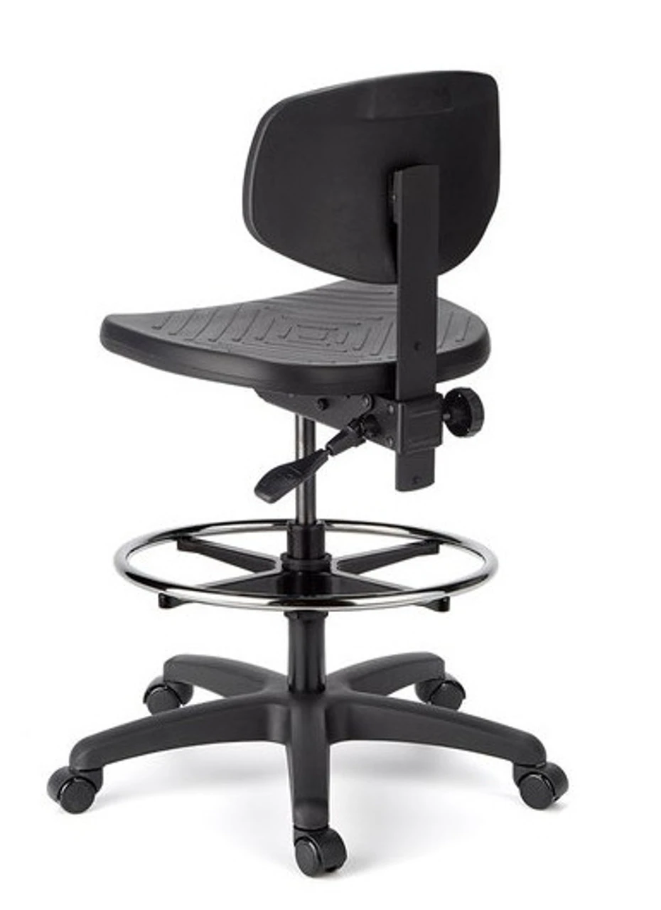 Cramer designs and engineers Med-Tech seating for – laboratories, medical offices, hospitals, and research facilities. Labs and spaces that require rigorous technical standards for comfort, cleanliness and durability, turn to Cramer for their expertise in clean design and ergonomic comfort. Rhino™ Basic Task Stool with Back has a self-skinned black urethane seat and lumbar support that resist punctures, tears, and spills. It is easily cleaned and is a great seating solution for higher education, labs and technical workspaces. This model is also available in three heights, with a 3 Way or 4 Way mechanism, and small or medium size seat back. Options include polished aluminum base, footring on stool height cylinders, and various caster types.