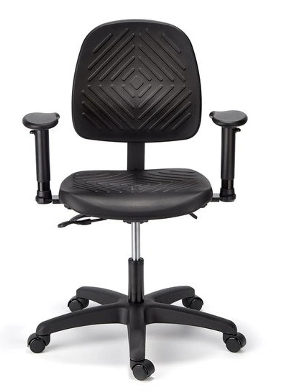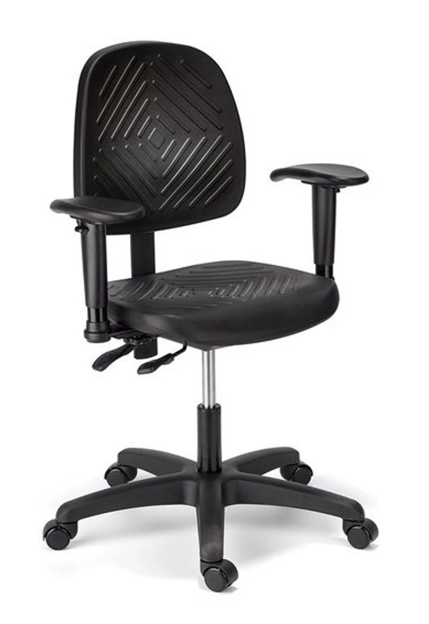 Cramer designs and engineers Med-Tech seating for – laboratories, medical offices, hospitals, and research facilities. Labs and spaces that require rigorous technical standards for comfort, cleanliness and durability, turn to Cramer for their expertise in clean design and ergonomic comfort. Rhino™ Basic Task Stool with Back has a self-skinned black urethane seat and lumbar support that resist punctures, tears, and spills. It is easily cleaned and is a great seating solution for higher education, labs and technical workspaces. This model is also available in three heights, with a 3 Way or 4 Way mechanism, and small or medium size seat back. Options include polished aluminum base, footring on stool height cylinders, and various caster types.