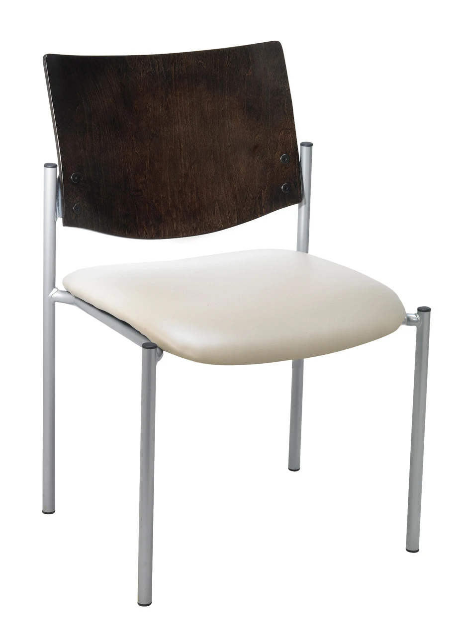 This Evolve Guest chair by kfi is a mutli-purpose chair perfect for side and guest applications, that also stacks! This version comes with an upholstered seat, an attractive wood stained back and a 16 gauge tubular frame in black or silver. This versatile chair is at home in training areas, cafeterias or as guest seating. Please call us if you are interested in a chair dolly for moving and stacking these. *An order of more than a dozen chairs may increase lead time to 2-3 weeks!