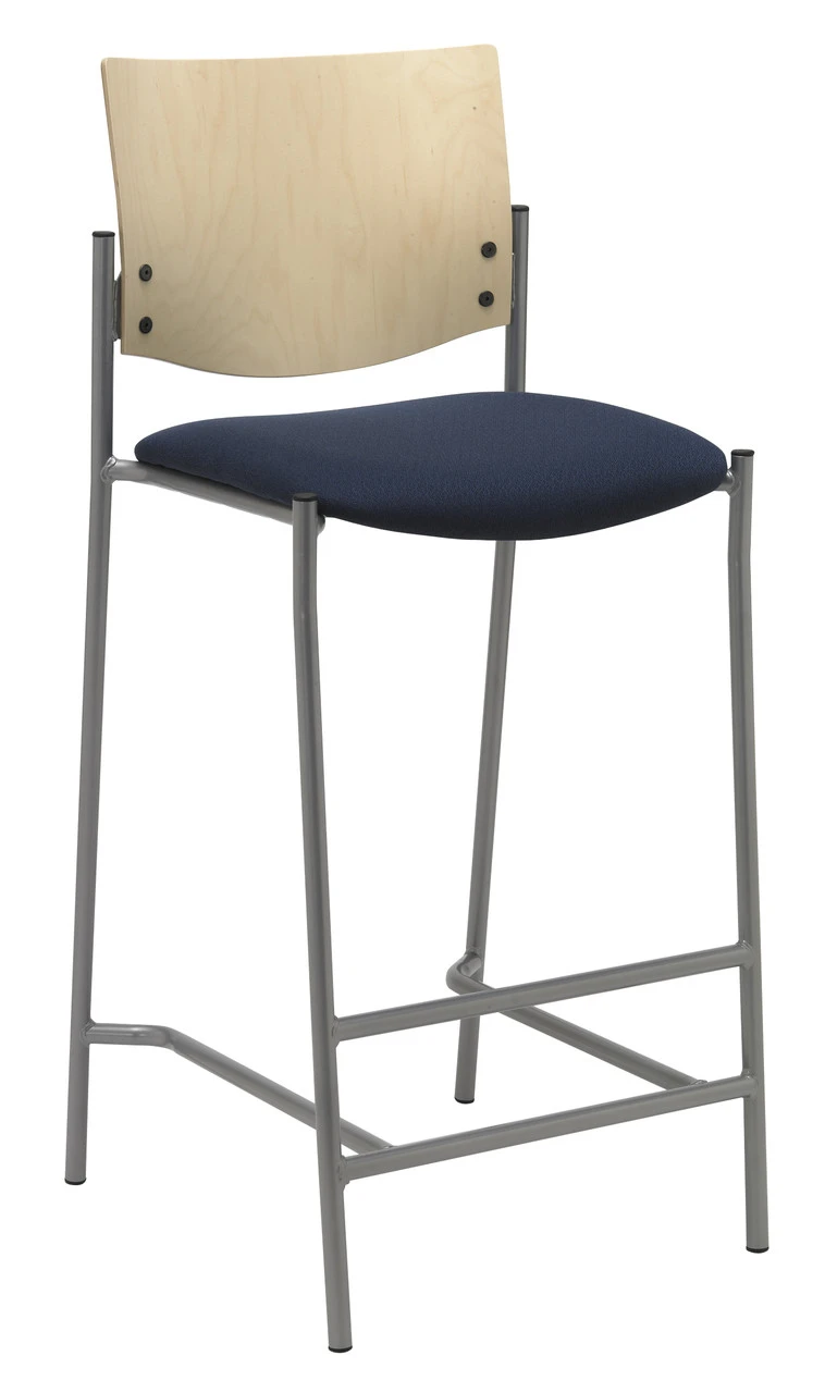 This Evolve Stool by kfi is perfect for cafes and lunch rooms, but is also at home in guest contexts. This version comes with an upholstered seat, an attractive wood stained back and a 16 gauge tubular frame in black or silver. Upholstered in a great selection of in-stock fabric and vinyl. An order of more than a dozen chairs may increase lead time!