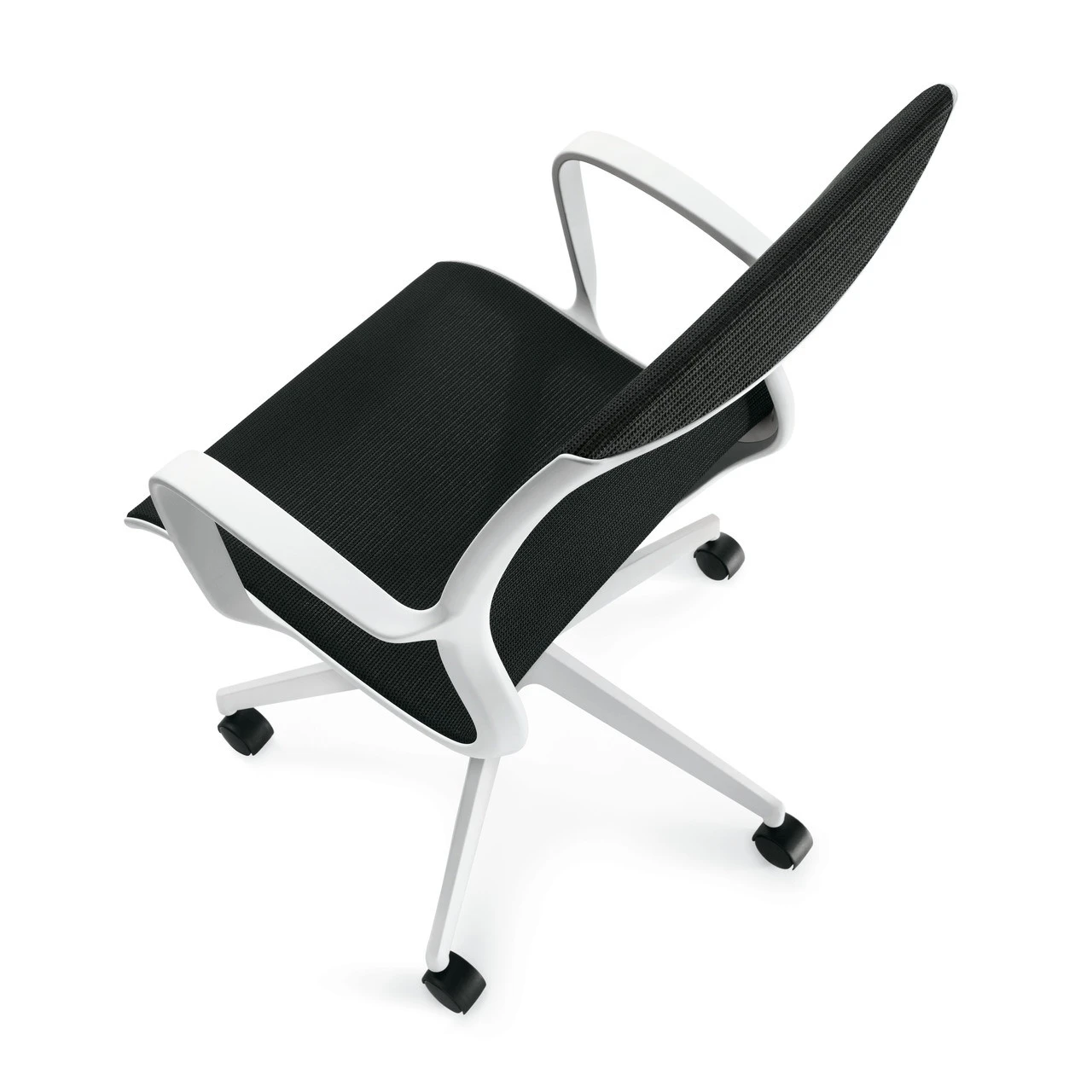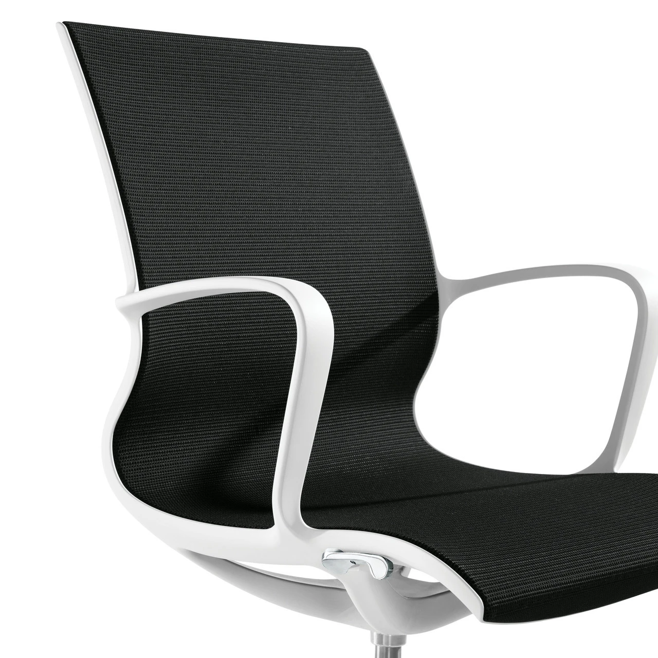 This new trendy office chair from Paul Brooks beautifully blends fluid structure and a mesh surface. This medium back office chair is perfect for training rooms, conference rooms and collaboration areas. This trendy office chair is upholstered in a Midnight Mesh with an Alabaster frame. You can also get it in an Asphalt frame and base with Storm Mesh.