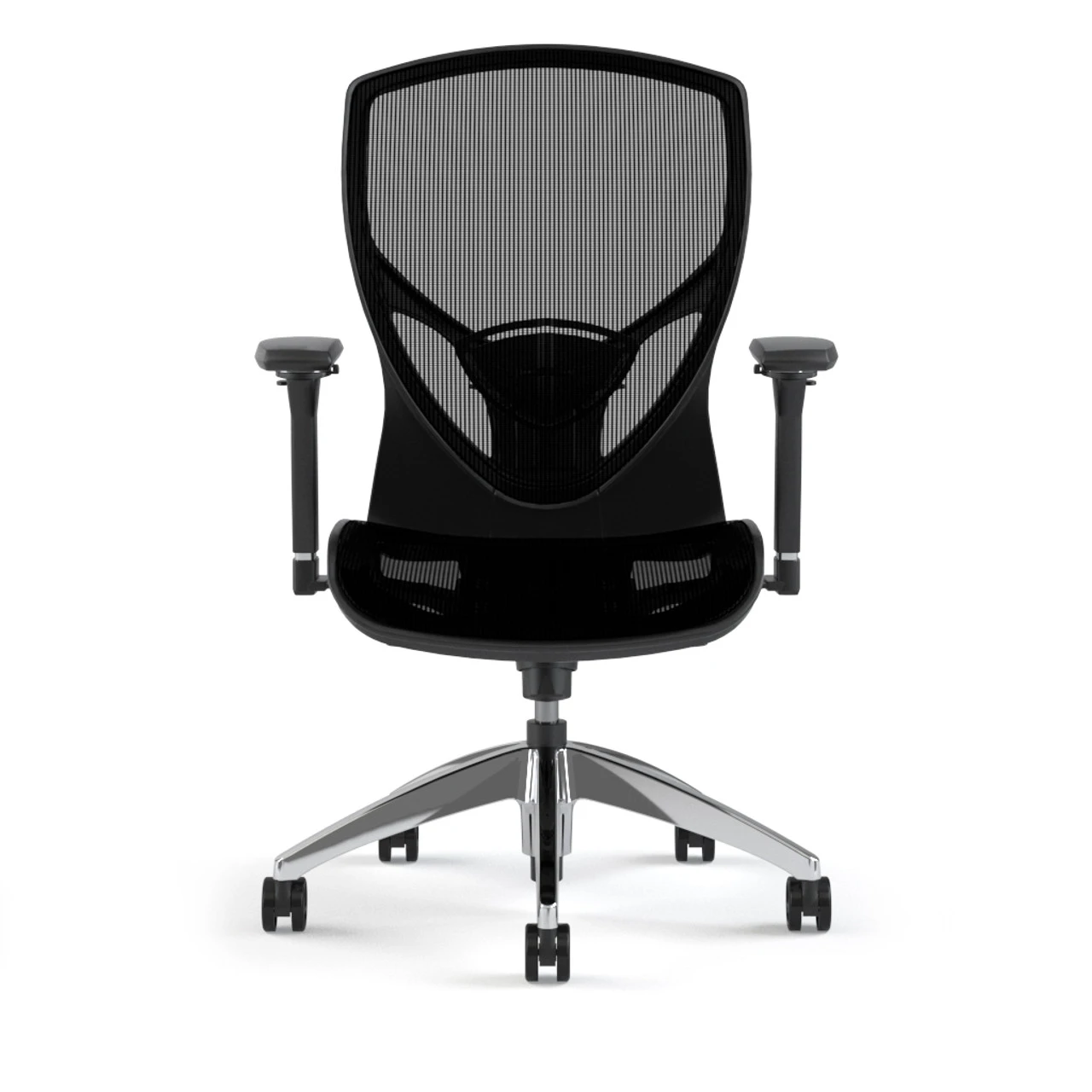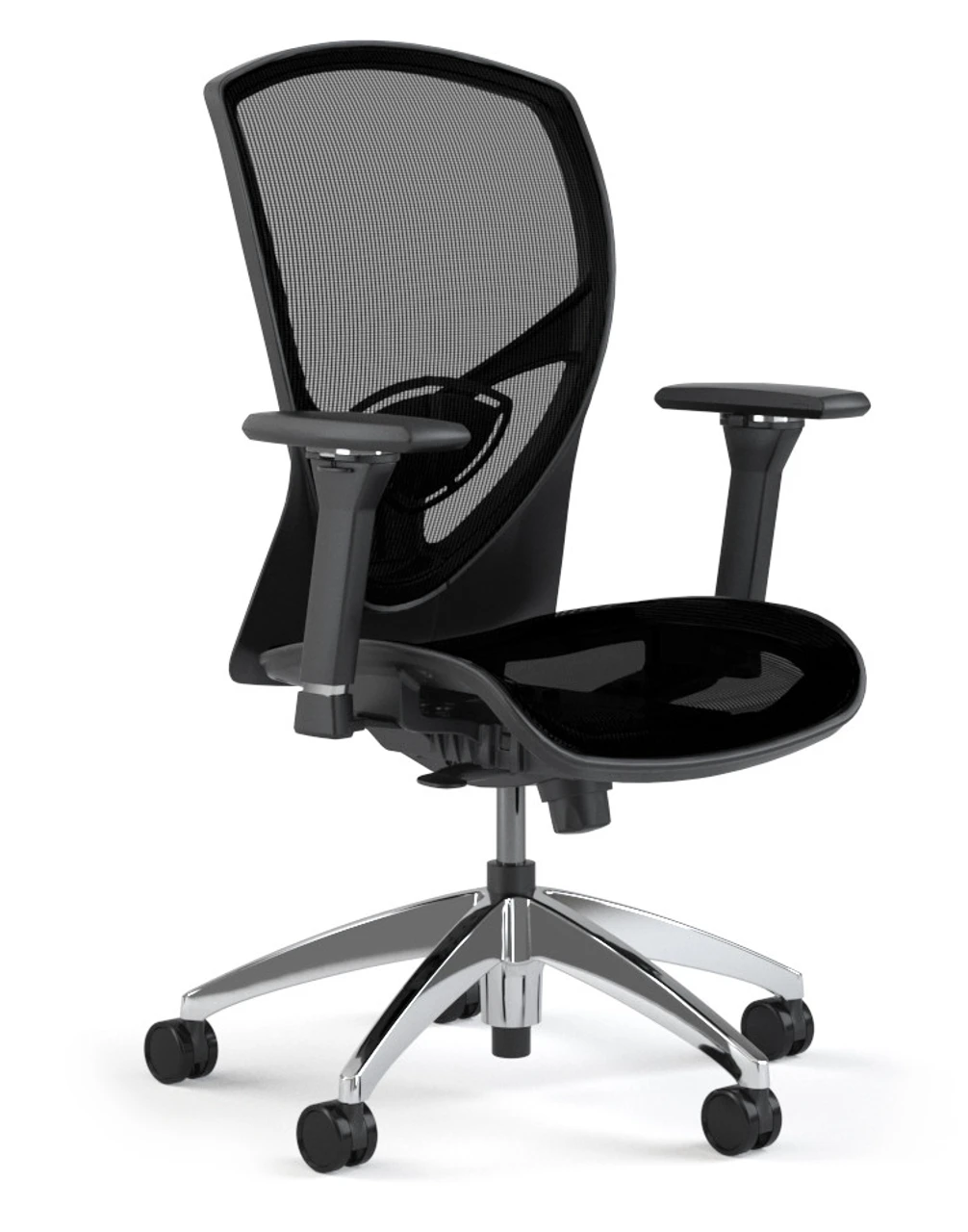 This @NCE Graphite Mesh Full Synchro Tasker has a full synchro mechanism, ratchet back with adjustable lumbar, 8-way adjustable arms, polished aluminum base and a weight capacity of 300 lbs. This stacked ergonomic chair is an affordable solution for the home office, executive suite or healthcare contexts. Above average weight rating. Can be bleach cleaned with a 10:1 solution.