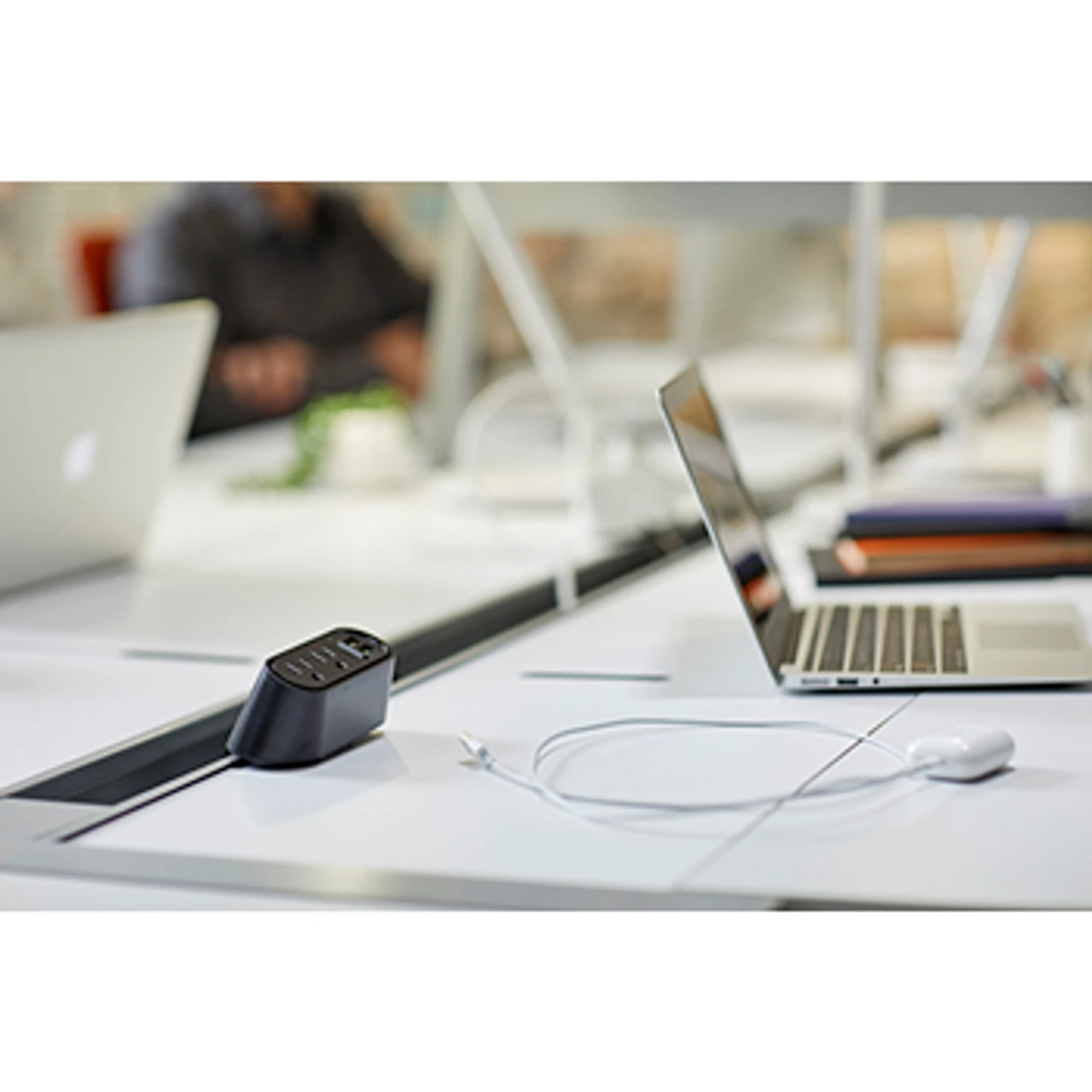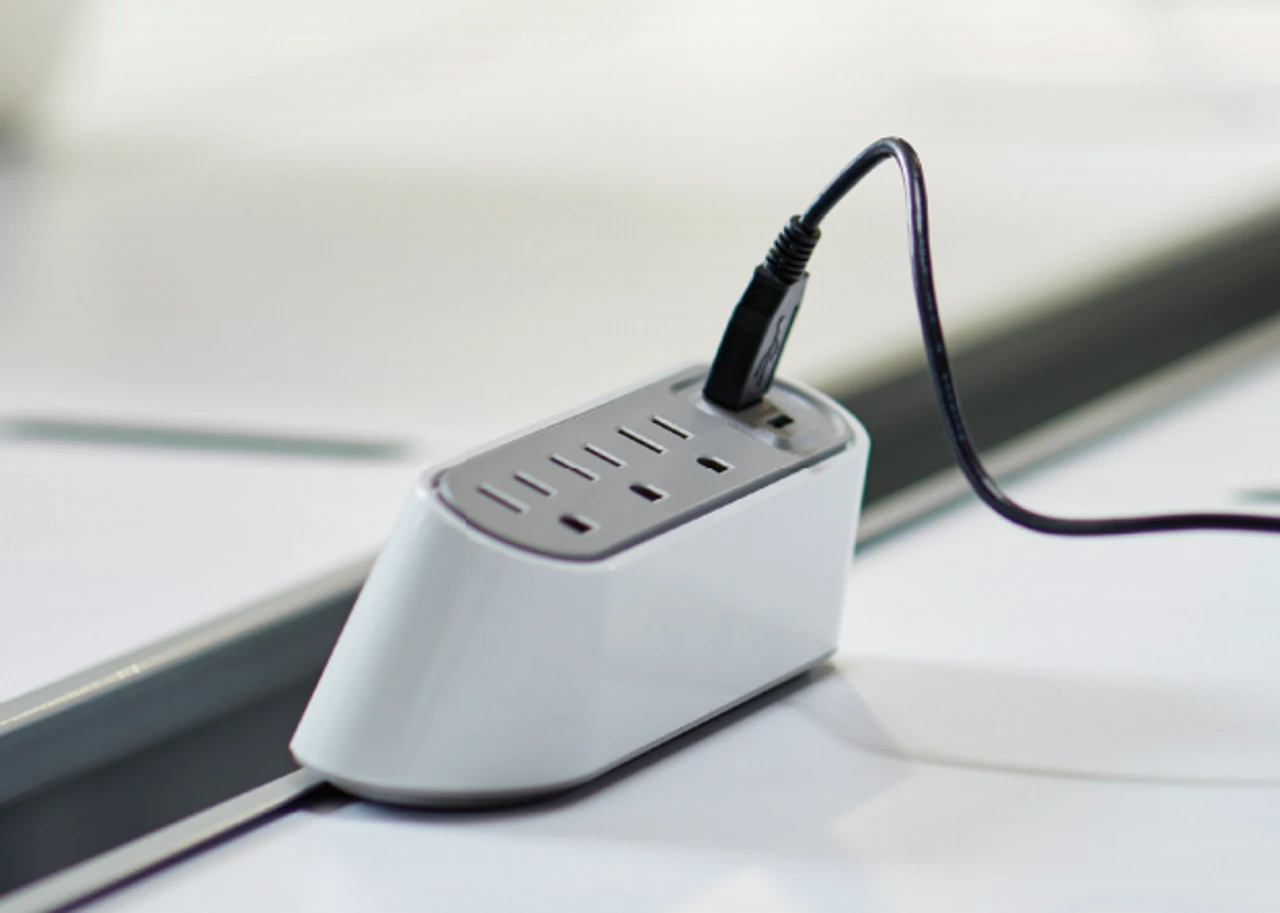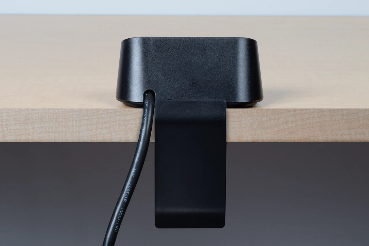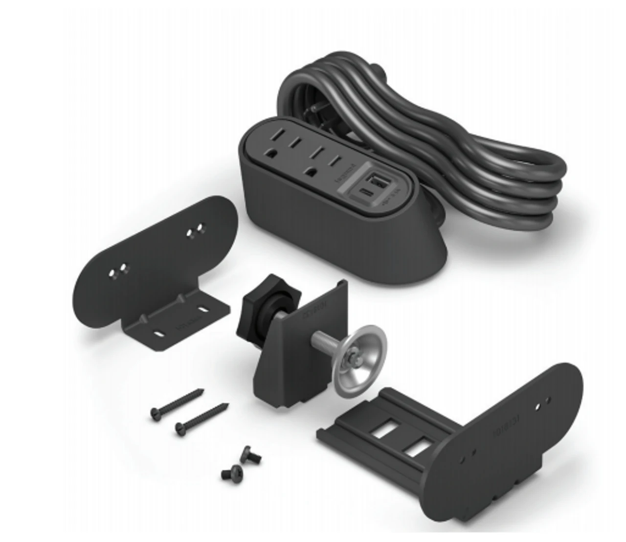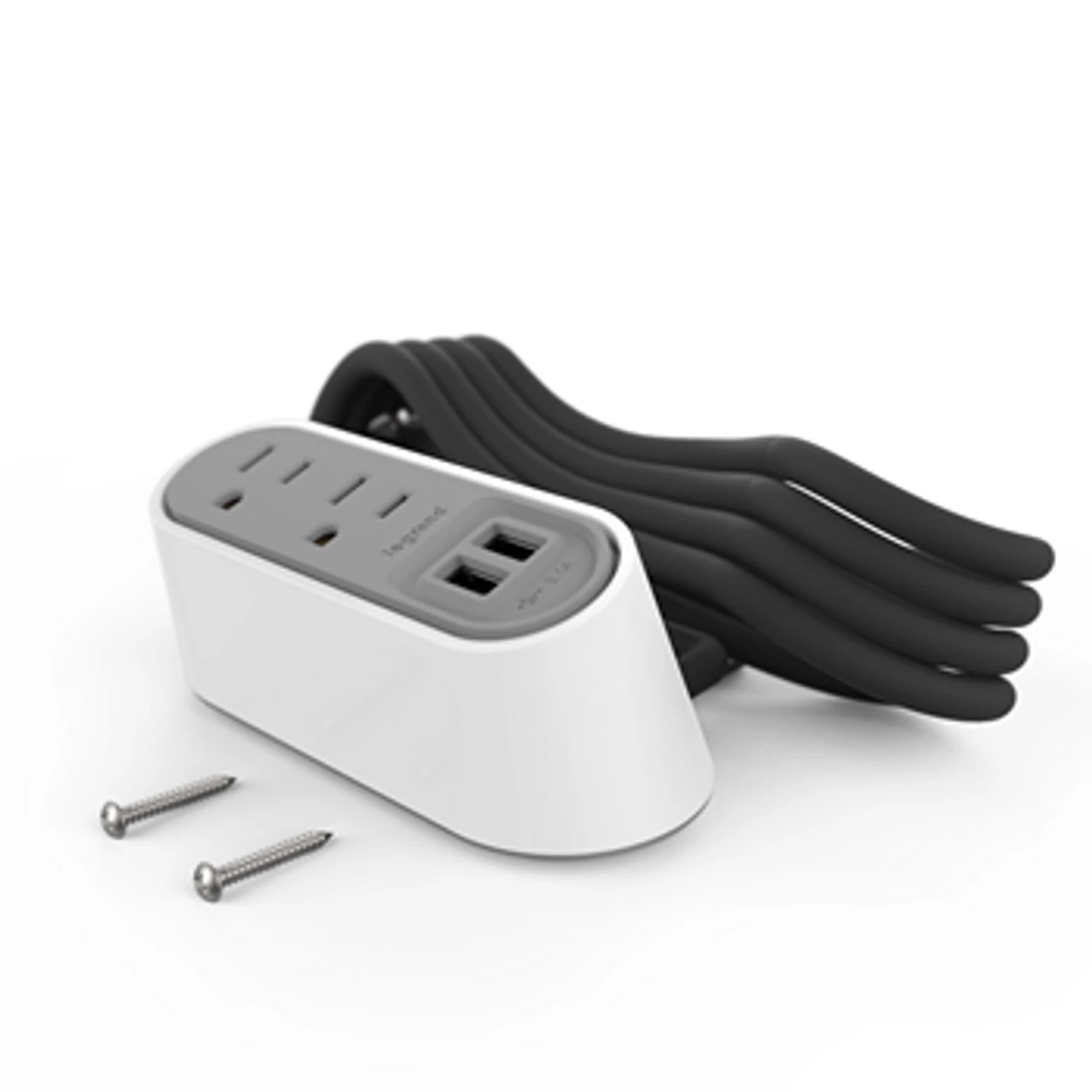 This Legrand Desktop Power Center is a slim desk-clamp power strip that perfectly organizes cords and puts efficient charging capabilities at your fingertips. The slim unit with power and USB integrated under a single cover, includes two or three tamper-resistant power receptacles and two (2) smart USB ports and has a 6′ cord. It includes a screw-in mounting plate that can be attached for forward facing outlets as well as other orientations with screws or clamp. This desk-clamp power strip is available in matte black or gloss white with a gray face.