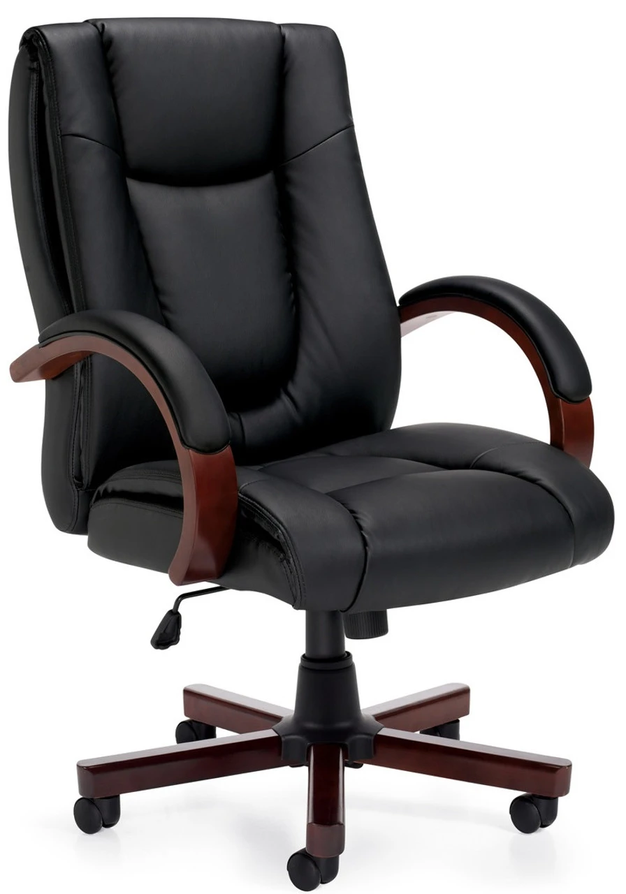 This OTG executive swivel tilt chair has accented Cordovan Mahogany wood trim on the arm supports and the base. The arm height on this tasker, works best for taller framed sitters. This chair is upholstered in Globals Luxhide leather which is a hybrid leather material that yields a very smooth hand and great surface consistency. Easy to clean and it breathes! This chair carries the OTG by Global factory warranty (click on the tab below).