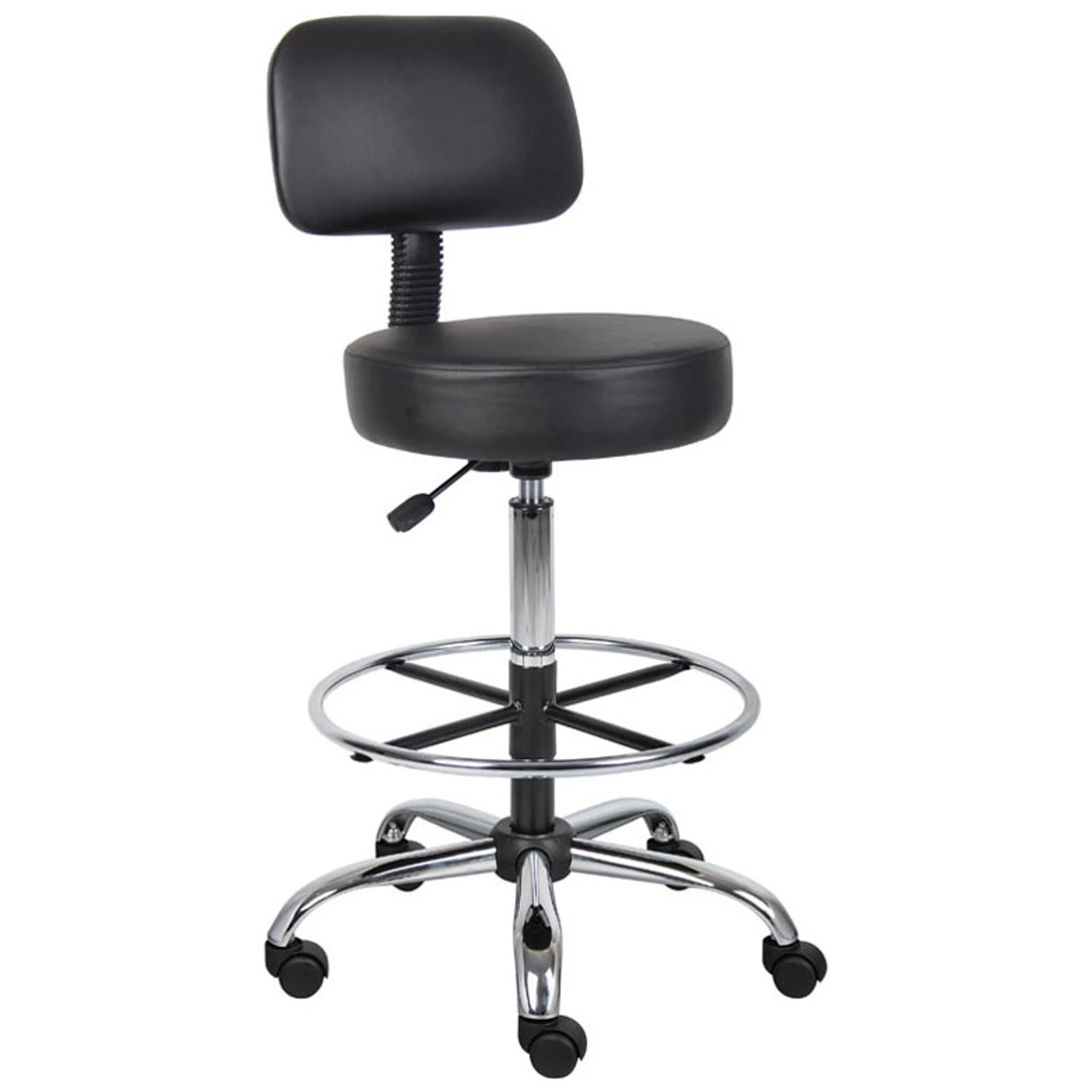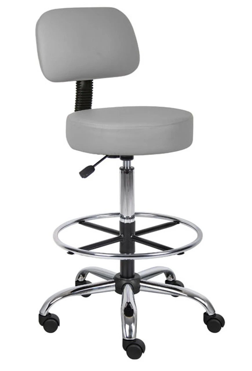 Nifty, well built stool is ideal for both the medical and commercial community. 275 lb. weight capacity with an adjustable seat height. Easy to clean urethane seat surfaces. Standard with a 20″ diameter metal foot ring. Thickly padded foam seat with back support.