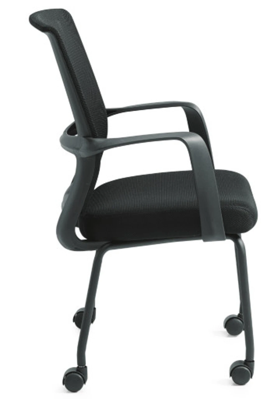 This multi-use guest arm chair can be fitted out with either carpet casters for ease of mobility or stationary leg glides. Each chair arrives with both! Your call on how you wish to ready it for use. Black mesh back and black urethane topped high density foam seat performs well in a variety of commercial applications.