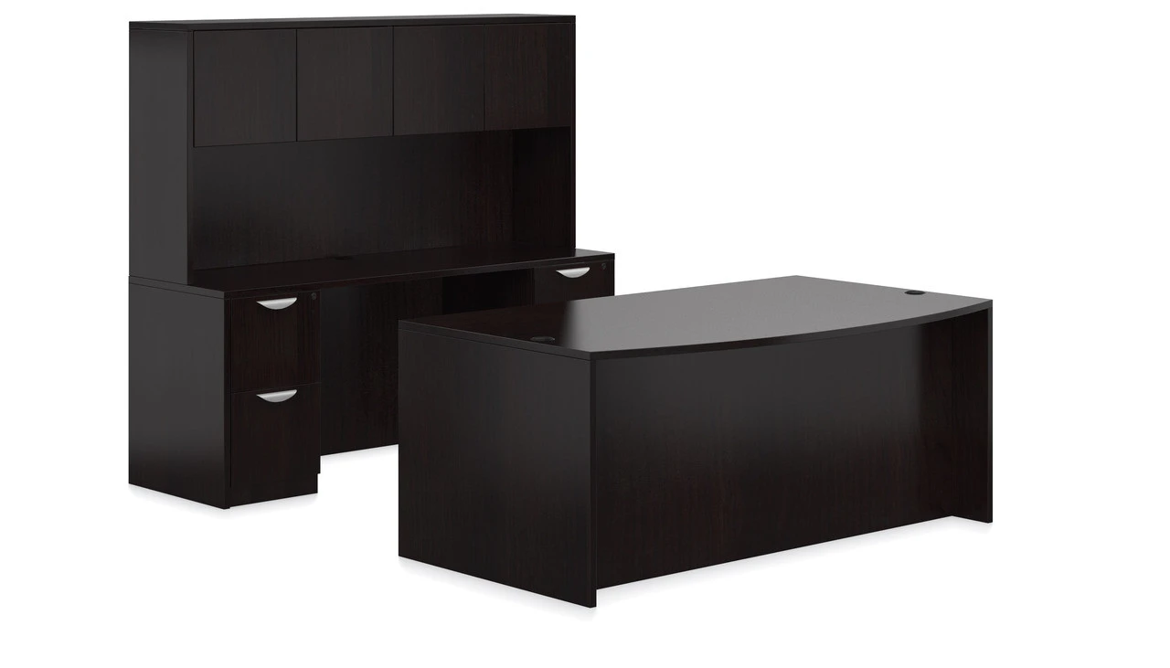 Value, value, and more value best describe the OTG SL-I Executive Bow-Front Desk Suite from our friends at Global. OTG gives you full extension, locking drawer pedestals, laminate finishes, and easy-to-assemble desk shells. (Pedestals arrive assembled). Metal pins and industry-approved cam fasteners make the desk shell assembly a snap. Grommets come standard on all desks and returns. The pedestals feature top-quality full-extension ball-bearing slides on all drawers while the 3mm matching ‘Super Edges’ protects your tops from chairs. Strong OTG factory warranty.