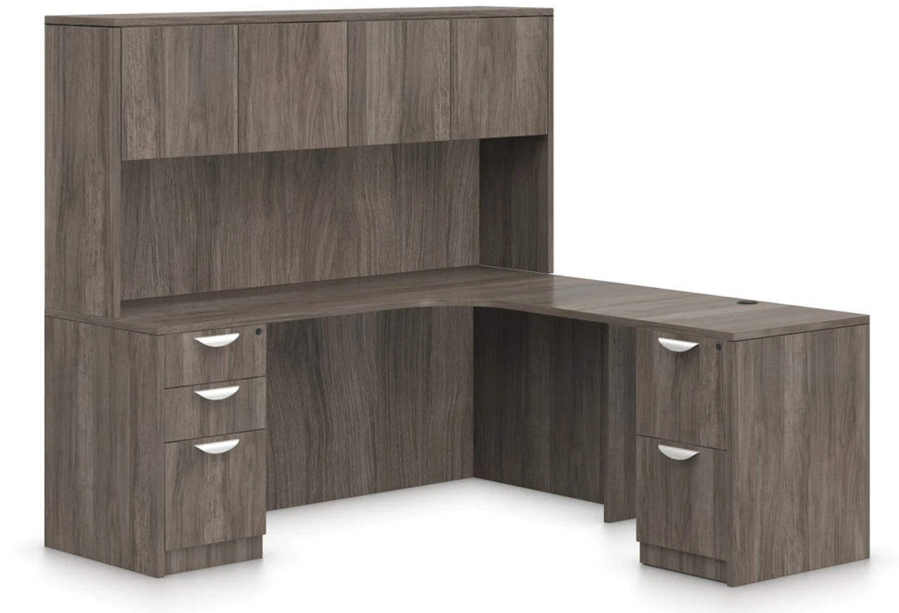 Value, value, and more value best describe this OTG SL-L Corner Desk Suite from our friends at Global. This OTG L-shaped desk with drawers features full-extension, full-height locking file pedestals with a laminate finish and easy-to-assemble desk shells. (Pedestals arrive assembled.) Metal pins and industry-approved cam fasteners make the desk shell assembly a snap. Grommets come standard on all desks and returns. The drawers on the L-shaped desk have top-quality full-extension ball-bearing slides. The 3mm matching ‘Super Edges’ on this corner desk suite protects your tops from chairs. Strong OTG factory warranty.