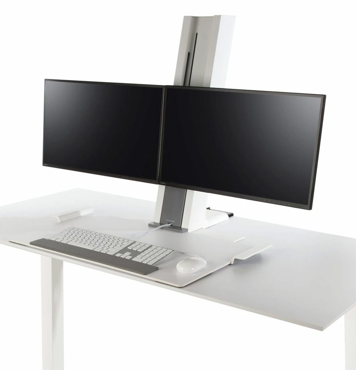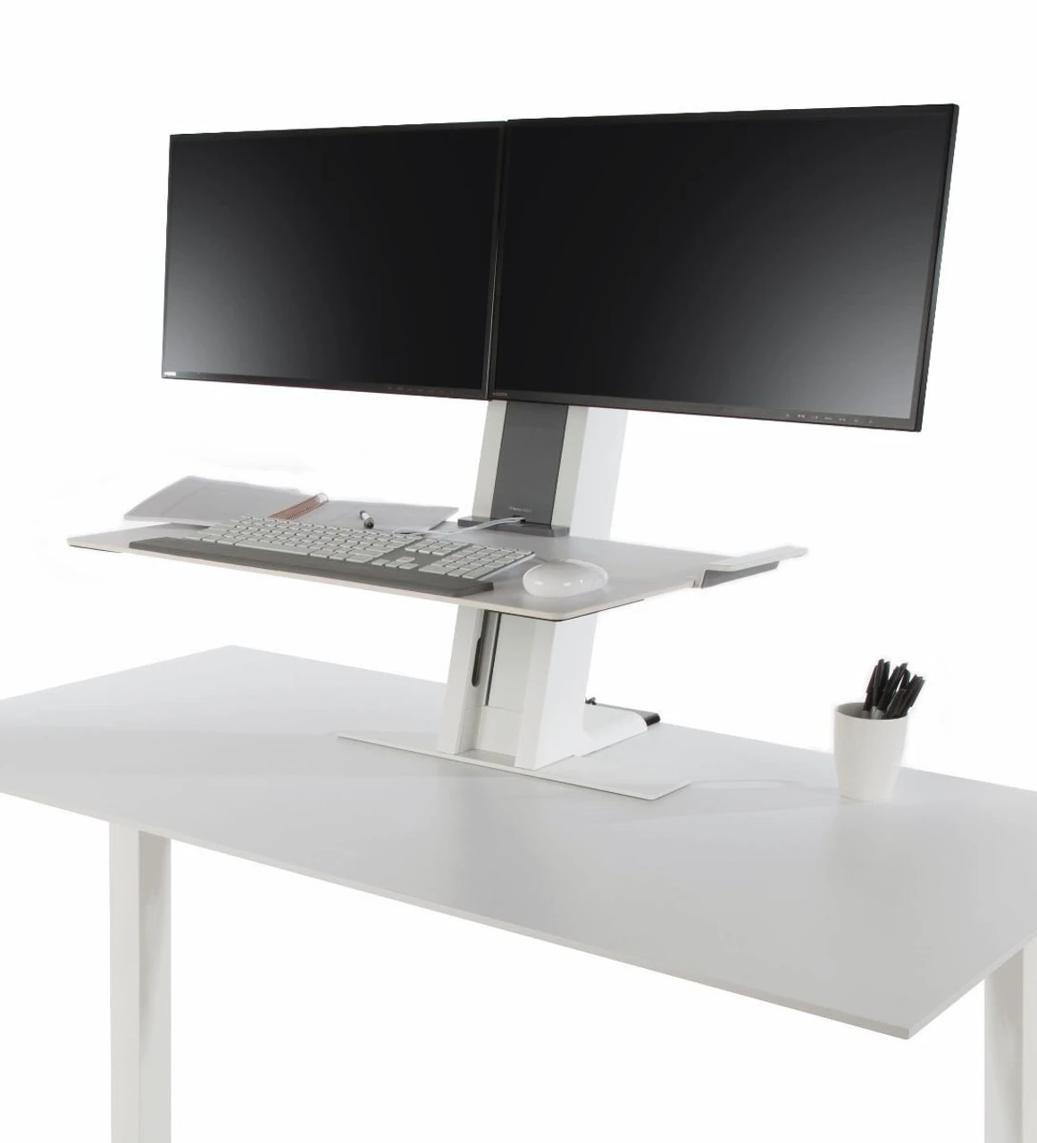 The Humanscale QuickStand large platform dual monitor mount raises the bar for sit-to-stand desks. Humanscale QuickStand seamlessly transforms any fixed-height desk, into a sit-to-stand desk by simply clamping onto the desktop edge. While sitting or standing the monitor can also be adjusted to accommodate to the user’s needs. This model is equipped with a large platform and a dual monitor mount. The Humanscale QuickStand is ideal for work surfaces that are 30-36 inches deep.
