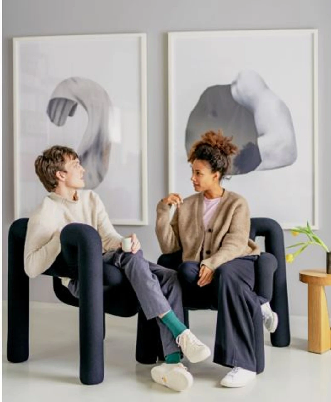 The postmodern Varier Ekstrem is not only an elegant guest chair, but functions as a sculptural piece! Designed during the 80’s it was a challenge to the conventional Scandinavian designs of the time. Combining aesthetics and ergonomics, Ekstrem allows you to sit forwards with your feet on the ground, sideways with your feet on the armrests or backwards, leaning into the back of the chair. Whatever way you choose, you’ll be comfortably cradled by this soft “Knit”, bespoke woolen upholstery textile by Norwegian Devold. Ekstrem is a sculptural seat that offers a sitting experience out of true luxury. This is a rare and highly specialized chair and cannot be returned to us unless deemed deflective or damaged during delivery. If you have any questions about its versatility and design please call any of our team members to discuss at 888-355-4999.