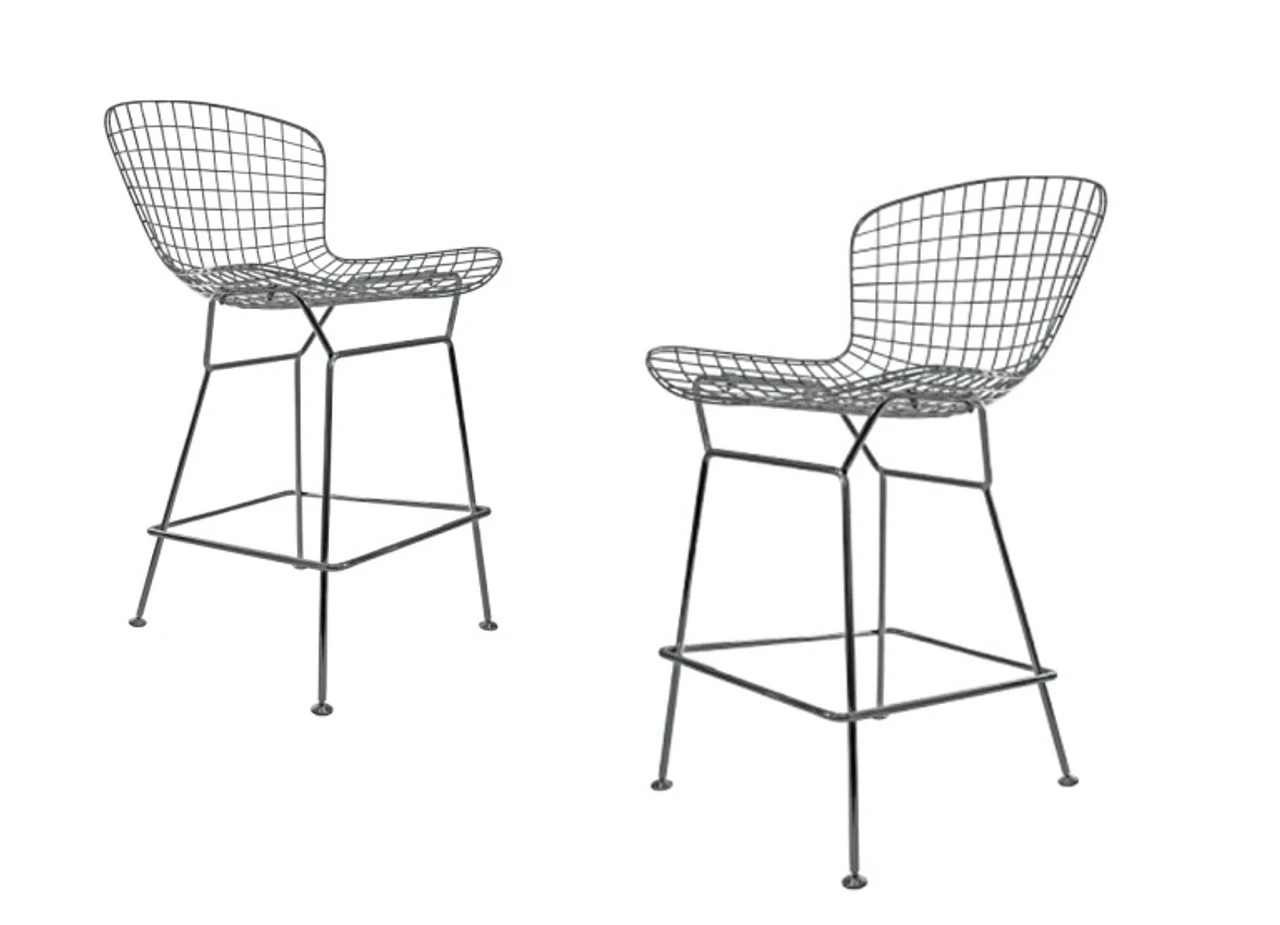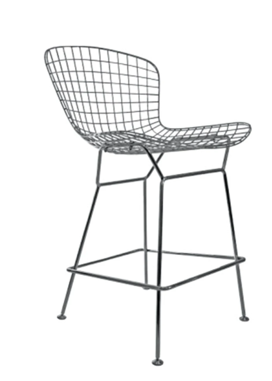 Contemporary highly polished wire frame metal medium height stool by Woodstock. This design is a modern classic. This high quality reproduction has a hand polished frame and sports an optional Eco-leather slim profile cushion as an option. This medium height stool is best used at counters and work surfaces 36″ in height. These stools are packaged at the factory in sets of two and must be ordered in multiples of two. We are unable to ship ‘odd’ amounts. Chairs are priced per carton.